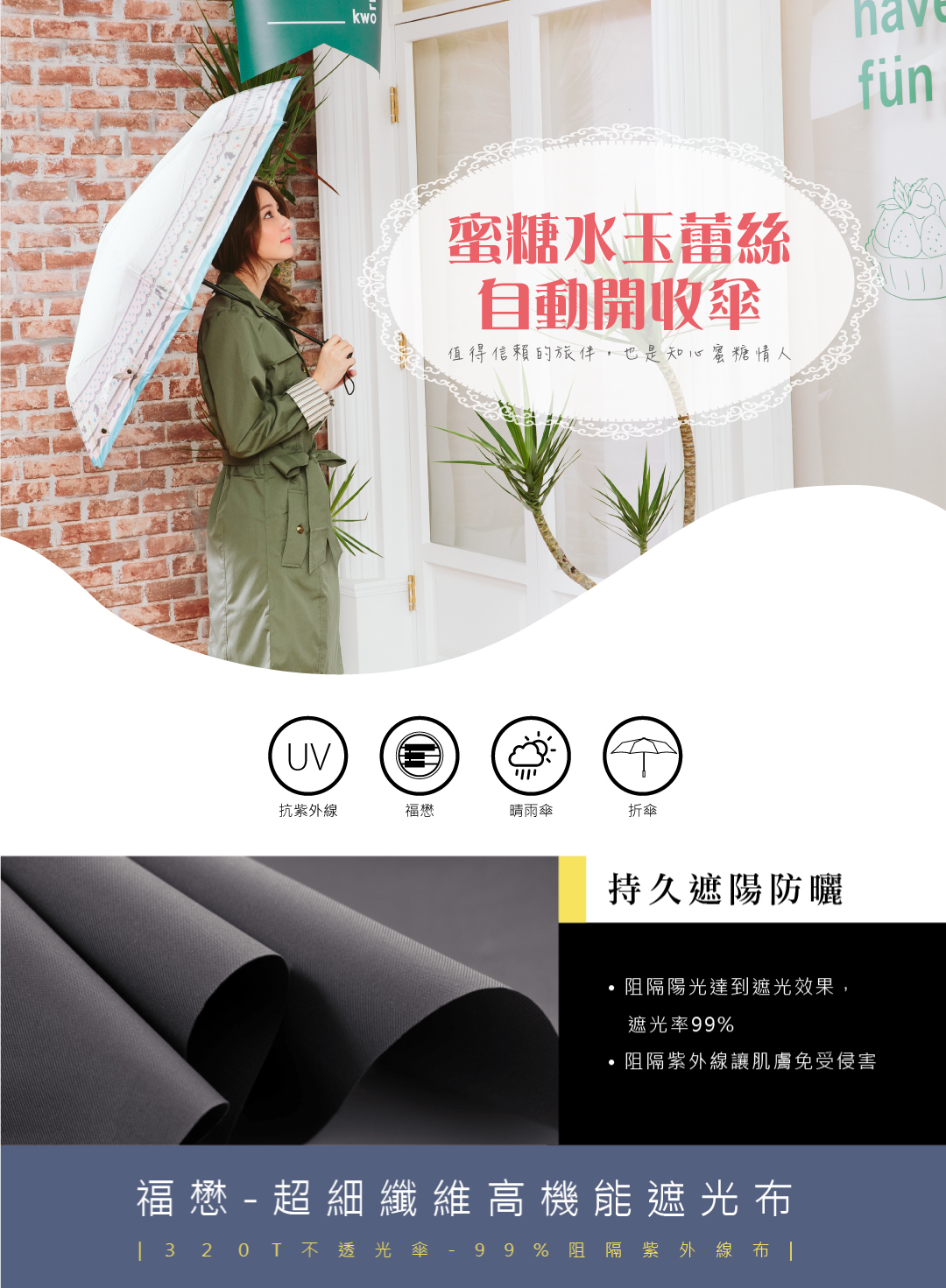 不論是炎炎夏日還是突如其來的細雨,蜜糖水玉自動傘 為你提供最貼心的防護。輕盈便攜、優雅百搭,讓你在各種情境下都能保持從容自信!