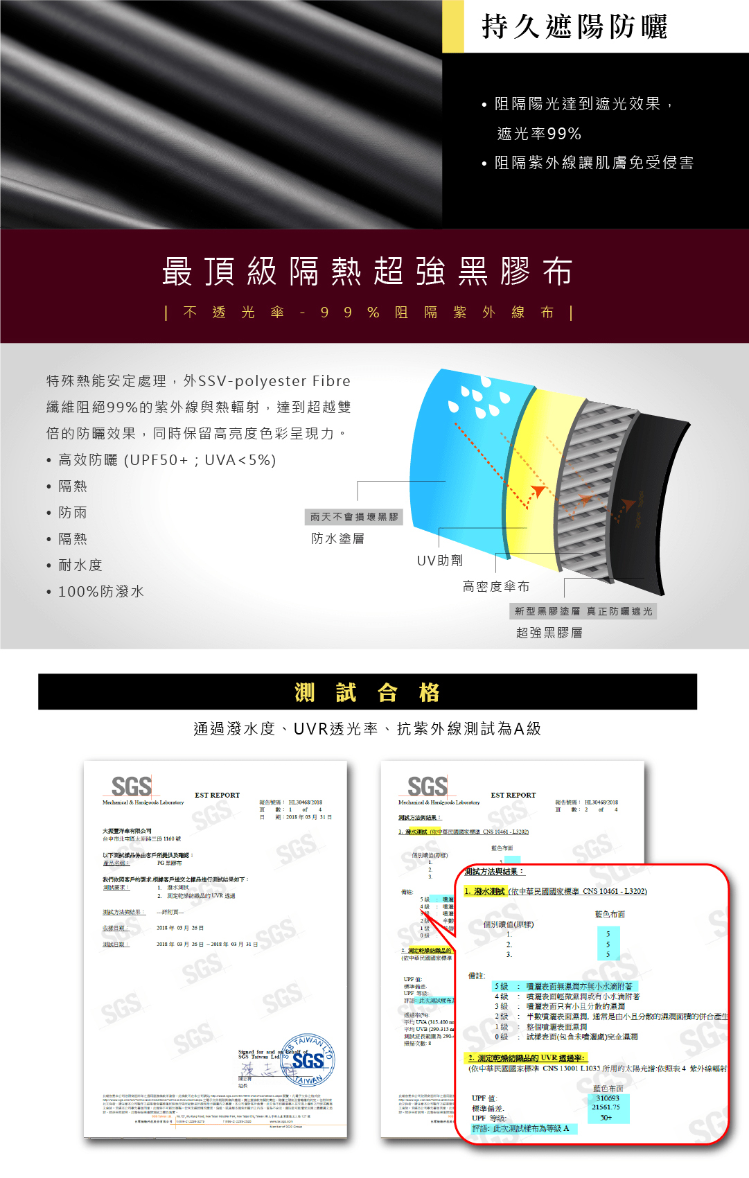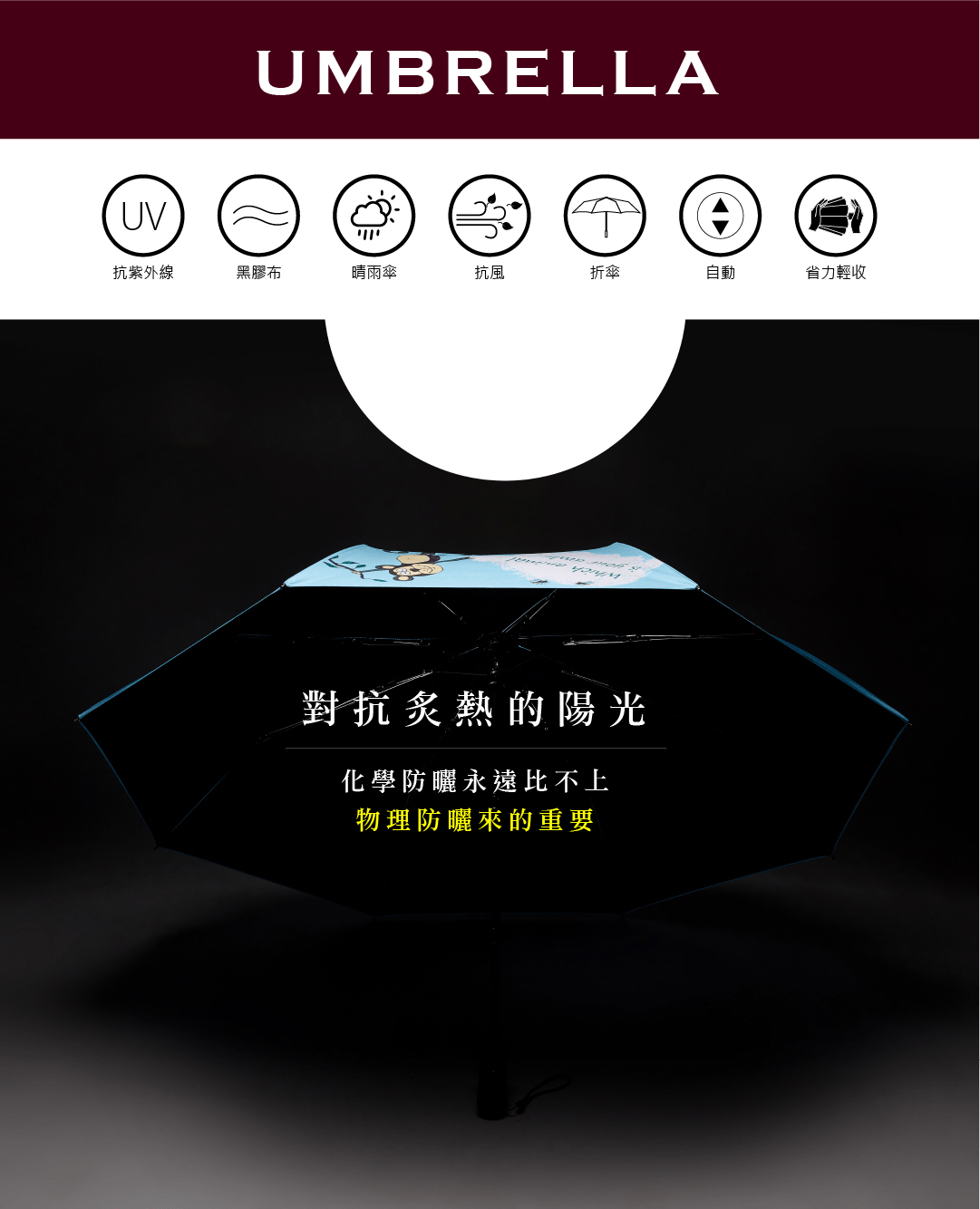 傘布特色: 高效防曬 UPF50+、UVA<5% / 80%防潑水