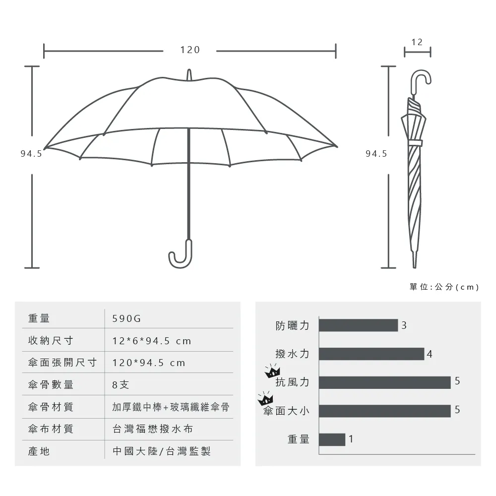 探索最新的超撥水科技,這款直傘絕對是您後車廂的必備清單之一!堅固耐用的8骨結構搭配玻璃纖維,讓您無需擔心風雨交加的天氣。台灣福懋撥水布製成,保證裡外都能保持乾爽,讓您在雨中也能盡情享受出行。