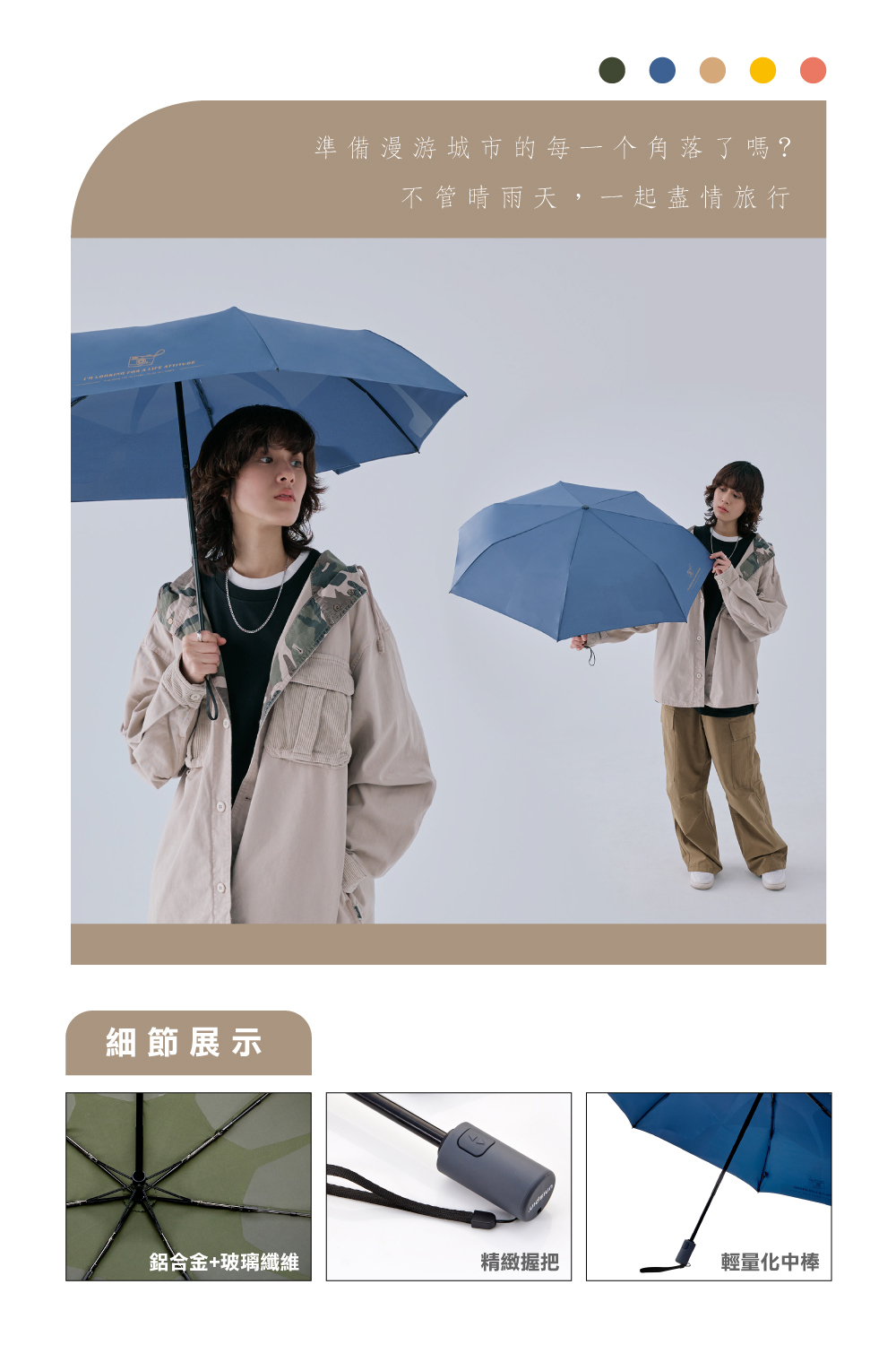 鋁合金加玻纖傘骨結構,輕盈堅固又抗風,保證您在惡劣天氣中仍能安全自在。