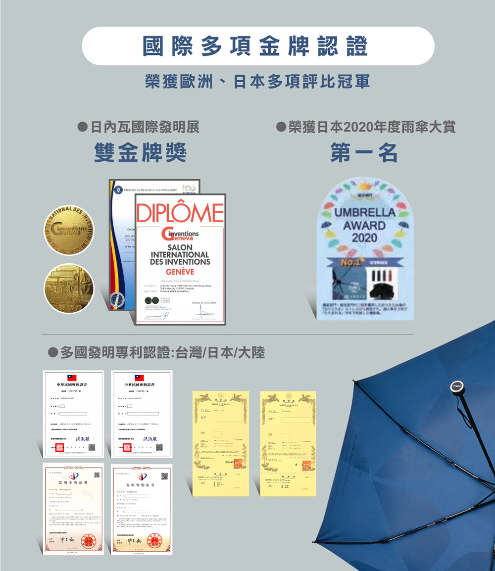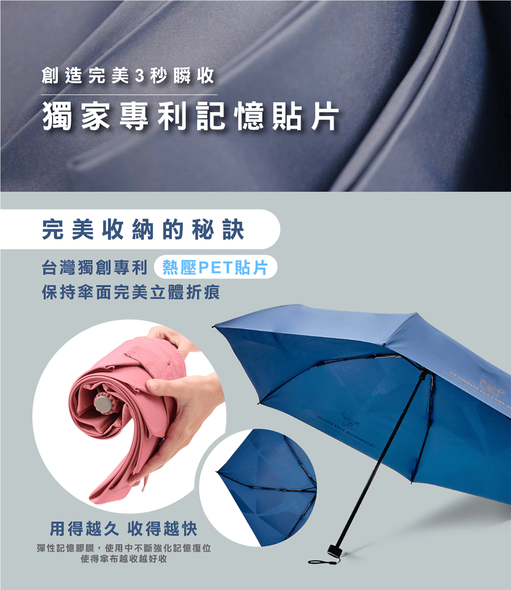 傘布採用獨家專利記憶技術,僅需三秒即可完美瞬收。